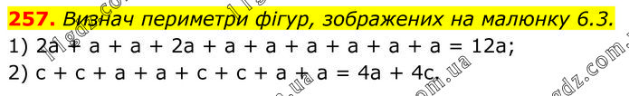 Визнач периметри фігур, зображених на малюнку 6.3. 1) 2a + a + a + 2a + a + a + a + a + a + a = 12a; 2) c + c + a + a + c + c + a + a = 4a + 4c.