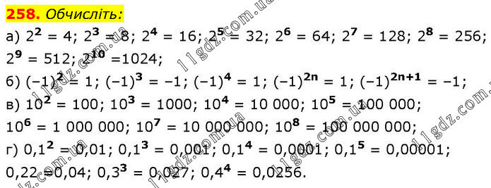 Обчисліть: а) 22 = 4; 23 = 8; 24 = 16; 25 = 32; 26 = 64; 27 = 128; 28 = 256; 29 = 512; 210 =1024; б) (–1)2 = 1; (–1)3 = –1; (–1)4 = 1; (–1)2n = 1; (–1)2n+1 = –1; в) 102 = 100; 103 = 1000; 104 = 10 000; 105 = 100 000; 106 = 1 000 000; 107 = 10 000 000; 108 = 100 000 000; г) 0,12 = 0,01; 0,13 = 0,001; 0,14 = 0,0001; 0,15 = 0,00001; 0,22 =0,04; 0,33 = 0,027; 0,44 = 0,0256.