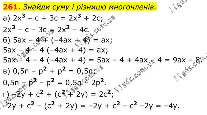 Знайди суму і різницю многочленів. a) 2x3 – c + 3c = 2x3 + 2c; 2x3 – c – 3c = 2x3 – 4c. б) 5ax – 4 + (–4ax + 4) = ax; 5ax – 4 – 4 (–4ax + 4) = ax; 5ax – 4 – 4 (–4ax + 4) = 5ax – 4 + 4ax – 4 = 9ax – 8. в) 0,5n – p2 + p2 = 0,5n; 0,5n – p2 – p2 = 0,5n – 2p2. г) –2y + c2 + (c2 + 2y) = 2c2; –2y + c2 – (c2 + 2y) = –2y + c2 – c2 –2y = –4y.