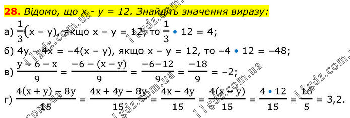 Відомо, що х - у = 12. Знайдіть значення виразу: a) 1/3(x – y), якщо х – у = 12, то 1/3 • 12 = 4; б) 4у – 4х = –4(х – у), якщо х – у = 12, то –4 • 12 = –48; в) (у - 6 - х)/9 = (-6 - (х - у))/9 = (-6-12)/9 = (-18)/9 = –2; г) (4(х + у) - 8у)/15 = (4х + 4у - 8у)/15 = (4х - 4у)/15 = (4(х - у))/15 = (4 • 12)/15 = 16/5 = 3,2.