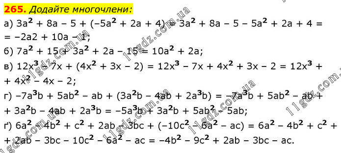 Додайте многочлени: а) За2 + 8а – 5 + (–5а2 + 2а + 4) = За2 + 8а – 5 – 5а2 + 2а + 4 = –2а2 + 10а – 1; б) 7а2 + 15 + 3а2 + 2а – 15 = 10а2 + 2а; в) 12x3 – 7x + (4x2 + Зx – 2) = 12x3 – 7х + 4х2 + Зх – 2 = 12x3 + 4x2 – 4x – 2; г) –7а3b + 5аb2 – аb + (За2b – 4аb + 2а3b) = –7а3b + 5аb2 – аb + За2b – 4аb + 2а3b = –5а3b + За2b + 5аb2 – 5аb; ґ) 6а2 – 4b2 + с2 + 2аb – 3bс + (–10c2 – 6а2 – ас) = 6a2 – 4b2 + с2 + 2аb – 3bс – 10c2 – 6a2 – ас = –4b2 – 9с2 + 2аb – 3bс – ас.