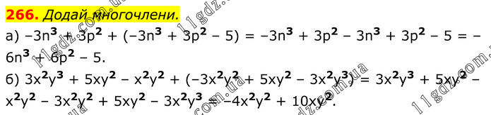 Додай многочлени. a) –3n3 + 3p2 + (–3n3 + 3p2 – 5) = –3n3 + 3p2 – 3n3 + 3p2 – 5 = –6n3 + 6p2 – 5. б) 3x2y3 + 5xy2 – x2y2 + (–3x2y2 + 5xy2 – 3x2y3) = 3x2y3 + 5xy2 – x2y2 – 3x2y2 + 5xy2 – 3x2y3 = –4x2y2 + 10xy2.