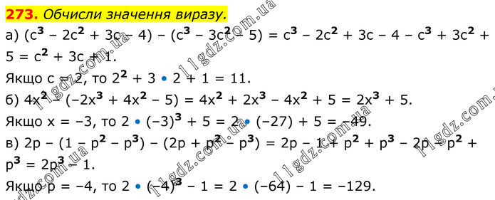 Обчисли значення виразу. а) (с3 – 2с2 + 3с – 4) – (с3 – 3с2 – 5) = с3 – 2с2 + 3с – 4 – с3 + 3с2 + 5 = с2 + 3с + 1. Якщо с = 2, то 22 + 3 • 2 + 1 = 11. б) 4х2 – (–2х3 + 4х2 – 5) = 4x2 + 2x3 – 4x2 + 5 = 2x3 + 5. Якщо х = –3, то 2 • (–3)3 + 5 = 2 • (–27) + 5 = –49. в) 2р – (1 – р2 – р3) – (2р + р2 – р3) = 2р – 1 + р2 + р3 – 2р – р2 + р3 = 2р3 – 1. Якщо р = –4, то 2 • (–4)3 – 1 = 2 • (–64) – 1 = –129.