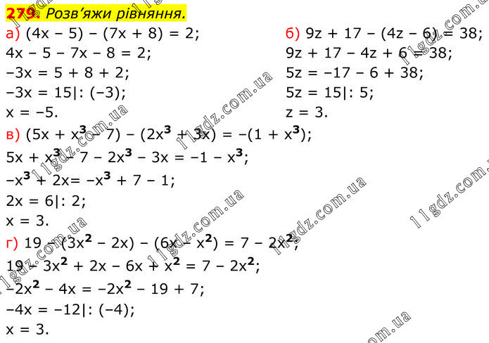 Розв’яжи рівняння. a) (4x – 5) – (7x + 8) = 2; 4x – 5 – 7x – 8 = 2; –3x = 5 + 8 + 2; –3x = 15|: (–3); x = –5. б) 9z + 17 – (4z – 6) = 38; 9z + 17 – 4z + 6 = 38; 5z = –17 – 6 + 38; 5z = 15|: 5; z = 3. в) (5x + x3 – 7) – (2x3 + 3x) = –(1 + x3); 5x + x3 – 7 – 2x3 – 3x = –1 – x3; –x3 + 2x= –x3 + 7 – 1; 2x = 6|: 2; x = 3. г) 19 – (3x2 – 2x) – (6x – x2) = 7 – 2x2; 19 – 3x2 + 2x – 6x + x2 = 7 – 2x2; –2x2 – 4x = –2x2 – 19 + 7; –4x = –12|: (–4); x = 3.