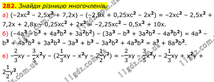 Знайди різницю многочленів. a) (–2xc2 – 2,5x2 + 7,2x) – (–2,8x + 0,25xc2 – 2x2) = –2xc2 – 2,5x2 + 7,2x + 2,8x – 0,25xc2 + 2x2 = –2,25xc2 – 0,5x2 + 10x. б) (–4a3 – b3 + 4a3b2 + 3a2b2) – (3a3 – b3 + 3a2b2 – 4a3b2) = 4a3 – b3 + 4a3b2 + 3a2b2 – 3a3 + b3 – 3a2b2 + 4a3b2 = a3 + 8a3b2. в) –2/3xy – 3/5x2y – (21/3xy – x2y – 21/2y2) = –2/3xy – 3/5x2y – 21/3xy + x2y + 21/2y2.