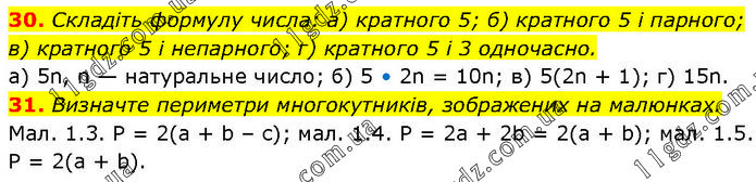 30. Складіть формулу числа: а) кратного 5; б) кратного 5 і парного; в) кратного 5 і непарного; г) кратного 5 і 3 одночасно. а) 5n, n — натуральне число; б) 5 • 2n = 10n; в) 5(2n + 1); г) 15n. 31. Визначте периметри многокутників, зображених на малюнках. Мал. 1.3. Р = 2(а + b – с); мал. 1.4. Р = 2а + 2b = 2(а + b); мал. 1.5. Р = 2(а + b).