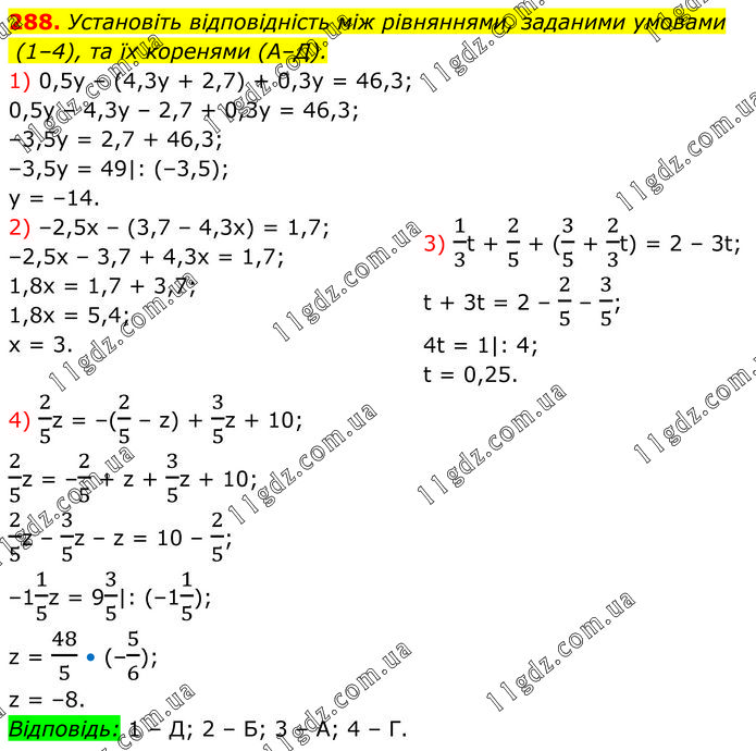 Установіть відповідність між рівняннями, заданими умовами (1–4), та їх коренями (А–Д). 1) 0,5y – (4,3y + 2,7) + 0,3y = 46,3; 0,5y – 4,3y – 2,7 + 0,3y = 46,3; –3,5y = 2,7 + 46,3; –3,5y = 49|: (–3,5); y = –14. 2) –2,5x – (3,7 – 4,3x) = 1,7; –2,5x – 3,7 + 4,3x = 1,7; 1,8x = 1,7 + 3,7; 1,8x = 5,4; x = 3. 3) 1/3t + 2/5 + (3/5 + 2/3t) = 2 – 3t; t + 3t = 2 – 2/5 – 3/5; 4t = 1|: 4; t = 0,25. 4) 2/5z = –(2/5 – z) + 3/5z + 10; 2/5z = –2/5 + z + 3/5z + 10; 2/5z – 3/5z – z = 10 – 2/5; –11/5z = 93/5|: (–11/5); z = 48/5 • (–5/6); z = –8. Відповідь: 1 – Д; 2 – Б; 3 – А; 4 – Г.