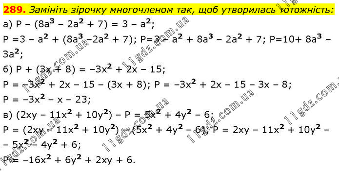 Замініть зірочку многочленом так, щоб утворилась тотожність: a) P – (8а3 – 2а2 + 7) = 3 – а2; Р =3 – а2 + (8а3 –2а2 + 7); P=3 – а2 + 8а3 – 2а2 + 7; P=10+ 8а3 – За2; б) Р + (Зx + 8) = –Зx2 + 2x – 15; P = –Зx2 + 2x – 15 – (Зx + 8); P = –Зх2 + 2х – 15 – Зх – 8; P = –Зx2 – x – 23; в) (2xy – 11x2 + 10y2) – P = 5х2 + 4у2 – 6; P = (2ху – 11x2 + 10y2) – (5x2 + 4у2 – 6); P = 2ху – 11x2 + 10y2 – – 5x2 – 4у2 + 6; P = –16x2 + 6y2 + 2ху + 6.