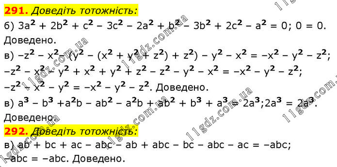 291. Доведіть тотожність: б) 3a2 + 2b2 + c2 – 3c2 – 2a2 + b2 – 3b2 + 2c2 – a2 = 0; 0 = 0. Доведено. в) –z2 – x2– (у2 – (х2 + у2 + z2) + z2) – у2 – x2 = –x2 – у2 – z2; –z2 – x2 – у2 + x2 + y2 + z2 – z2 – y2 – x2 = –х2 – у2 – z2; –z2 – x2 – у2 = –x2 – у2 – z2. Доведено. в) а3 – b3 +a2b – ab2 – a2b + ab2 + b3 + a3 = 2а3;2а3 = 2а3. Доведено. 292. Доведіть тотожність: в) ab + bc + ac – abc – ab + abc – bc – abc – aс = –аbс; –abc = –abc. Доведено.