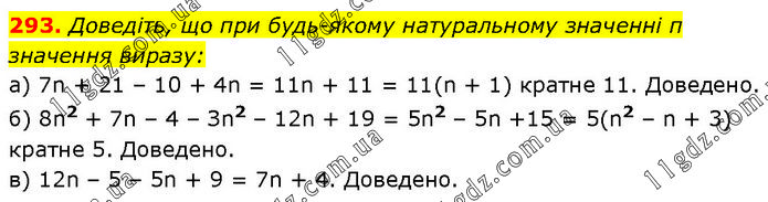 Доведіть, що при будь-якому натуральному значенні п значення виразу: а) 7n + 21 – 10 + 4n = 11n + 11 = 11(n + 1) кратне 11. Доведено. б) 8n2 + 7n – 4 – Зn2 – 12n + 19 = 5n2 – 5n +15 = 5(n2 – n + 3) кратне 5. Доведено. в) 12n – 5 – 5n + 9 = 7n + 4. Доведено.