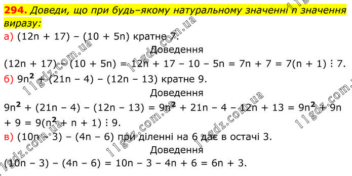 Доведи, що при будь–якому натуральному значенні n значення виразу: a) (12n + 17) – (10 + 5n) кратне 7. Доведення (12n + 17) – (10 + 5n) = 12n + 17 – 10 – 5n = 7n + 7 = 7(n + 1) ⋮ 7. б) 9n2 + (21n – 4) – (12n – 13) кратне 9. Доведення 9n2 + (21n – 4) – (12n – 13) = 9n2 + 21n – 4 – 12n + 13 = 9n2 + 9n + 9 = 9(n2 + n + 1) ⋮ 9. в) (10n – 3) – (4n – 6) при діленні на 6 дає в остачі 3. Доведення (10n – 3) – (4n – 6) = 10n – 3 – 4n + 6 = 6n + 3.