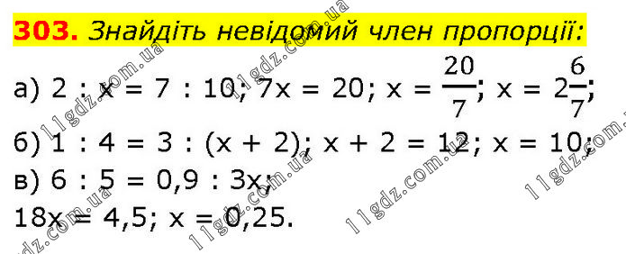 Знайдіть невідомий член пропорції: а) 2 : х = 7 : 10; 7х = 20; х = 20/7; х = 26/7; б) 1 : 4 = 3 : (х + 2); х + 2 = 12; х = 10; в) 6 : 5 = 0,9 : Зх; 18х = 4,5; х = 0,25.