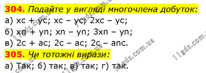 304. Подайте у вигляді многочлена добуток: а) хс + ус; хс – ус; 2хс – ус; б) хn + уn; хn – уn; 3хn – уn; в) 2с + ас; 2с – ас; 2с – аnс. 305. Чи тотожні вирази: а) Так; б) так; в) так; г) так.