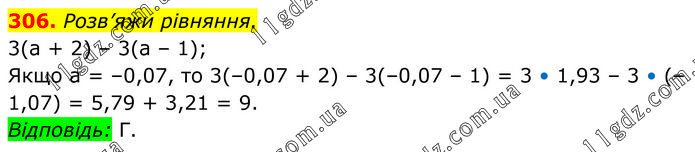 Розв’яжи рівняння. 3(a + 2) – 3(a – 1); Якщо а = –0,07, то 3(–0,07 + 2) – 3(–0,07 – 1) = 3 • 1,93 – 3 • (–1,07) = 5,79 + 3,21 = 9. Відповідь: Г.