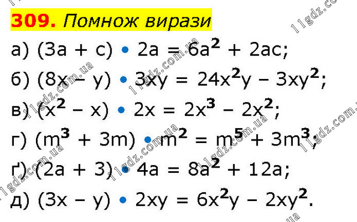 Помнож вирази а) (За + с) • 2а = 6а2 + 2ас; б) (8x – у) • Зху = 24х2у – Зxу2; в) (х2 – х) • 2х = 2х3 – 2x2; г) (m3 + 3m) • m2 = m5 + Зm3; ґ) (2а + 3) • 4а = 8а2 + 12а; д) (Зx – у) • 2ху = 6х2у – 2ху2.