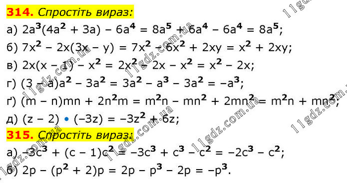314. Спростіть вираз: а) 2а3(4а2 + За) – 6а4 = 8а5 + 6a4 – 6a4 = 8а5; б) 7x2 – 2х(3х – у) = 7x2 – 6x2 + 2ху = x2 + 2ху; в) 2х(х – 1) – x2 = 2х2 – 2х – x2 = x2 – 2х; г) (3 – a)a2 – За2 = 3a2 – а3 – 3a2 = –а3; ґ) (m – n)mn + 2n2m = m2n – mn2 + 2mn2 = m2n + mn2; д) (z – 2) • (–Зz) = –Зz2 + 6z; 315. Спростіть вираз: а) –Зс3 + (с – 1)с2 = –Зс3 + с3 – c2 = –2с3 – с2; б) 2р – (р2 + 2)р = 2p – p3 – 2p = –p3.