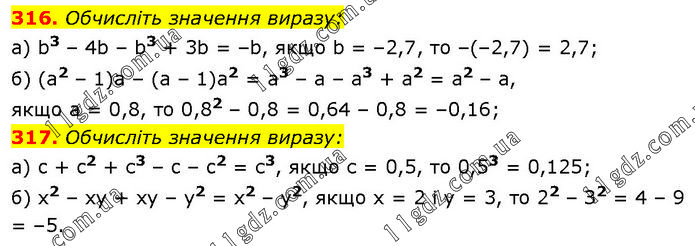 316. Обчисліть значення виразу: а) b3 – 4b – b3 + 3b = –b, якщо b = –2,7, то –(–2,7) = 2,7; б) (а2 – 1)а – (а – 1)а2 = a3 – а – a3 + а2 = а2 – а, якщо а = 0,8, то 0,82 – 0,8 = 0,64 – 0,8 = –0,16; 317. Обчисліть значення виразу: а) c + c2 + с3 – c – c2 = с3, якщо с = 0,5, то 0,53 = 0,125; б) x2 – xy + xy – у2 = x2 – y2, якщо х = 2 і у = 3, то 22 – З2 = 4 – 9 = –5.