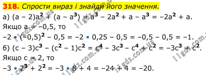Спрости вираз і знайди його значення. а) (а – 2)а2 + (а – а3) = а3 – 2а2 + а – а3 = –2а2 + а. Якщо а = –0,5, то –2 • (–0,5)2 – 0,5 = –2 • 0,25 – 0,5 = –0,5 – 0,5 = –1. б) (с – 3)с3 – (с2 – 1)с2 = с4 – 3с3 – с4 + с2 = –3с3 + с2. Якщо с = 2, то –3 • 23 + 22 = –3 • 8 + 4 = –24 + 4 = –20.