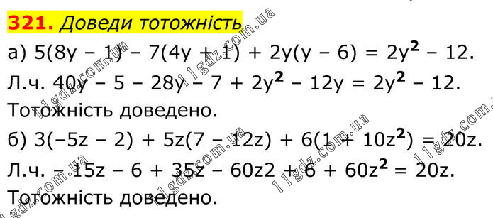 Доведи тотожність а) 5(8у – 1) – 7(4у + 1) + 2у(у – 6) = 2у2 – 12. Л.ч. 40у – 5 – 28у – 7 + 2у2 – 12у = 2у2 – 12. Тотожність доведено. б) 3(–5z – 2) + 5z(7 – 12z) + 6(1 + 10z2) = 20z. Л.ч. – 15z – 6 + 35z – 60z2 + 6 + 60z2 = 20z. Тотожність доведено.