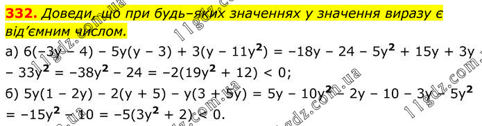 Доведи, що при будь–яких значеннях у значення виразу є від’ємним числом. a) 6(–3y – 4) – 5y(y – 3) + 3(y – 11y2) = –18y – 24 – 5y2 + 15y + 3y – 33y2 = –38y2 – 24 = –2(19y2 + 12) < 0; б) 5y(1 – 2y) – 2(y + 5) – y(3 + 5y) = 5y – 10y2 – 2y – 10 – 3y – 5y2 = –15y2 – 10 = –5(3y2 + 2) < 0.