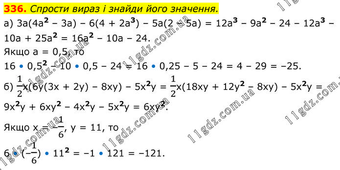 Спрости вираз і знайди його значення. а) 3а(4а2 – 3а) – 6(4 + 2а3) – 5а(2 – 5а) = 12а3 – 9а2 – 24 – 12а3 – 10а + 25а2 = 16а2 – 10а – 24. Якщо а = 0,5, то 16 • 0,52 – 10 • 0,5 – 24 = 16 • 0,25 – 5 – 24 = 4 – 29 = –25. б) 1/2х(6у(3х + 2у) – 8ху) – 5х2у = 1/2х(18ху + 12у2 – 8ху) – 5х2у = 9х2у + 6ху2 – 4х2у – 5х2у = 6ху2. Якщо х = –1/6, у = 11, то 6 • (–1/6) • 112 = –1 • 121 = –121.