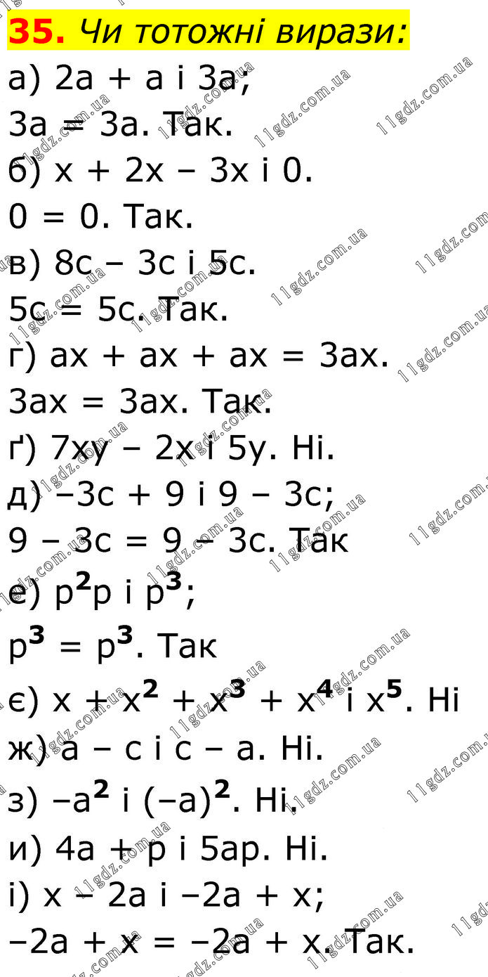Чи тотожні вирази: а) 2а + а і 3а; 3а = 3а. Так. б) х + 2х – 3х і 0. 0 = 0. Так. в) 8с – 3с і 5с. 5с = 5с. Так. г) ах + ах + ах = 3ах. 3ах = 3ах. Так. ґ) 7ху – 2х і 5у. Ні. д) –3с + 9 і 9 – 3с; 9 – 3с = 9 – 3с. Так е) р2р і р3; р3 = р3. Так є) х + х2 + х3 + х4 і х5. Ні ж) а – с і с – а. Ні. з) –а2 і (–а)2. Ні. и) 4а + р і 5ар. Ні. і) х – 2а і –2а + х; –2а + х = –2а + х. Так.