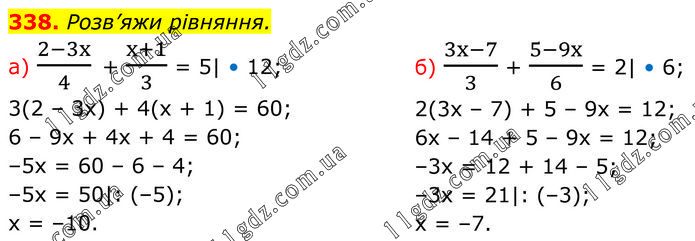 Розв’яжи рівняння. a) (2-3x)/4 + (x+1)/3 = 5| • 12; 3(2 – 3x) + 4(x + 1) = 60; 6 – 9x + 4x + 4 = 60; –5x = 60 – 6 – 4; –5x = 50|: (–5); x = –10. б) (3x-7)/3 + (5-9x)/6 = 2| • 6; 2(3x – 7) + 5 – 9x = 12; 6x – 14 + 5 – 9x = 12; –3x = 12 + 14 – 5; –3x = 21|: (–3); x = –7.