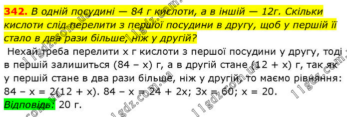 В одній посудині — 84 г кислоти, а в іншій — 12г. Скільки кислоти слід перелити з першої посудини в другу, щоб у першій її стало в два рази більше, ніж у другій? Нехай треба перелити х г кислоти з першої посудини у другу, тоді в першій залишиться (84 – х) г, а в другій стане (12 + х) г, так як у першій стане в два рази більше, ніж у другій, то маємо рівняння: 84 – х = 2(12 + х). 84 – х = 24 + 2х; 3х = 60; х = 20. Відповідь: 20 г.