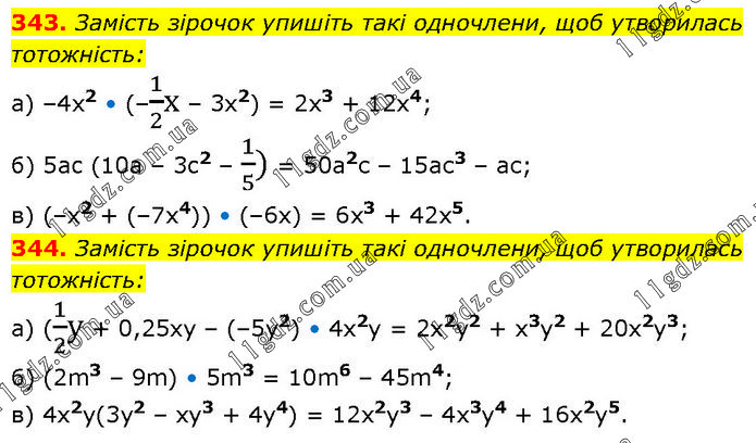 343. Замість зірочок упишіть такі одночлени, щоб утворилась тотожність: a) –4x2 • (–1/2x – 3x2) = 2х3 + 12х4; б) 5ac (10a – 3c2 – 1/5) = 50а2с – 15ас3 – ас; в) (–x2 + (–7x4)) • (–6х) = 6х3 + 42x5. 344. Замість зірочок упишіть такі одночлени, щоб утворилась тотожність: а) (1/2y + 0,25ху – (–5y2) • 4х2у = 2х2у2 + х3у2 + 20x2y3; б) (2m3 – 9m) • 5m3 = 10m6 – 45m4; в) 4х2у(3у2 – ху3 + 4y4) = 12x2у3 – 4х3у4 + 16x2y5.