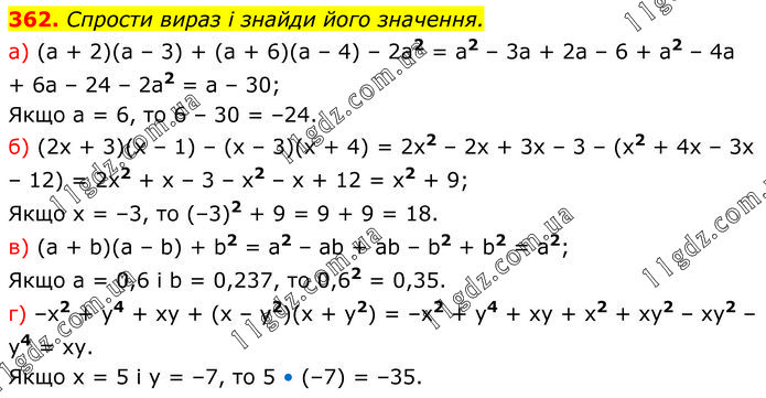 Спрости вираз і знайди його значення. a) (a + 2)(a – 3) + (a + 6)(a – 4) – 2a2 = a2 – 3a + 2a – 6 + a2 – 4a + 6a – 24 – 2a2 = a – 30; Якщо а = 6, то 6 – 30 = –24. б) (2x + 3)(x – 1) – (x – 3)(x + 4) = 2x2 – 2x + 3x – 3 – (x2 + 4x – 3x – 12) = 2x2 + x – 3 – x2 – x + 12 = x2 + 9; Якщо х = –3, то (–3)2 + 9 = 9 + 9 = 18. в) (a + b)(a – b) + b2 = a2 – ab + ab – b2 + b2 = a2; Якщо a = 0,6 i b = 0,237, то 0,62 = 0,35. г) –x2 + y4 + xy + (x – y2)(x + y2) = –x2 + y4 + xy + x2 + xy2 – xy2 – y4 = xy. Якщо х = 5 і у = –7, то 5 • (–7) = –35.