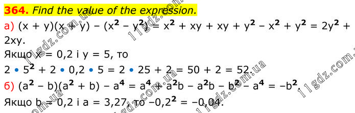 Find the value of the expression. a) (x + y)(x + y) – (x2 – y2) = x2 + xy + xy + y2 – x2 + y2 = 2y2 + 2xy. Якщо х = 0,2 і у = 5, то 2 • 52 + 2 • 0,2 • 5 = 2 • 25 + 2 = 50 + 2 = 52. б) (a2 – b)(a2 + b) – a4 = a4 + a2b – a2b – b2 – a4 = –b2. Якщо b = 0,2 i a = 3,27, то –0,22 = –0,04.
