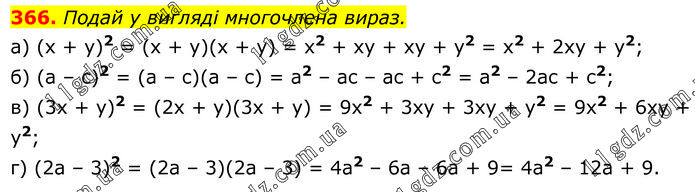 Подай у вигляді многочлена вираз. а) (x + y)2 = (x + y)(x + y) = x2 + xy + xy + y2 = x2 + 2xy + y2; б) (a – c)2 = (a – c)(a – c) = a2 – ac – ac + c2 = a2 – 2ac + c2; в) (3x + y)2 = (2x + y)(3x + y) = 9x2 + 3xy + 3xy + y2 = 9x2 + 6xy + y2; г) (2a – 3)2 = (2a – 3)(2a – 3) = 4a2 – 6a – 6a + 9= 4a2 – 12a + 9.
