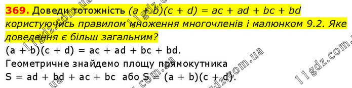 Доведи тотожнiсть (а + b)(с + d) = ас + ad + bc + bd користуючись правилом множення многочленів і малюнком 9.2. Яке доведення є більш загальним? (а + b)(с + d) = ac + ad + bc + bd. Геометричне знайдемо площу прямокутника S = ad + bd + ac + bc або S = (а + b)(с + d).