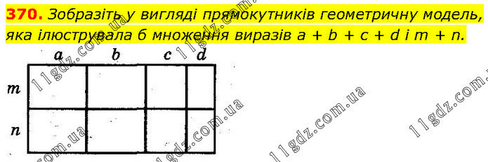 Зобразіть у вигляді прямокутників геометричну модель, яка ілюструвала б множення виразів а + b + с + d і m + n.