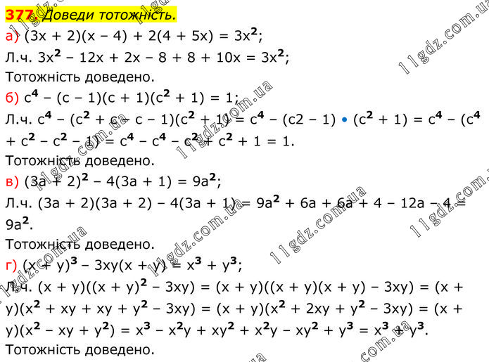 Доведи тотожність. а) (3х + 2)(х – 4) + 2(4 + 5х) = 3х2; Л.ч. 3х2 – 12х + 2х – 8 + 8 + 10х = 3х2; Тотожність доведено. б) с4 – (с – 1)(с + 1)(с2 + 1) = 1; Л.ч. с4 – (с2 + с – с – 1)(с2 + 1) = с4 – (с2 – 1) • (с2 + 1) = с4 – (с4 + с2 – с2 – 1) = с4 – с4 – с2 + с2 + 1 = 1. Тотожність доведено. в) (3а + 2)2 – 4(3а + 1) = 9а2; Л.ч. (3а + 2)(3а + 2) – 4(3а + 1) = 9а2 + 6а + 6а + 4 – 12а – 4 = 9а2. Тотожність доведено. г) (x + y)3 – 3xy(x + y) = x3 + y3; Л.ч. (x + y)((x + y)2 – 3xy) = (x + y)((x + y)(x + y) – 3xy) = (x + y)(x2 + xy + xy + y2 – 3xy) = (x + y)(x2 + 2xy + y2 – 3xy) = (x + y)(x2 – xy + y2) = x3 – x2y + xy2 + x2y – xy2 + y3 = x3 + y3. Тотожність доведено.