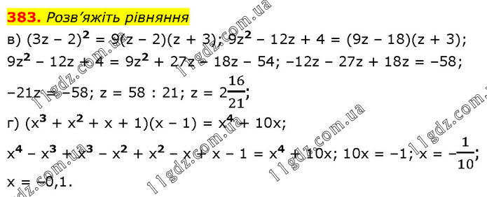 Розв’яжіть рівняння в) (Зz – 2)2 = 9(z – 2)(z + 3); 9z2 – 12z + 4 = (9z – 18)(z + 3); 9z2 – 12z + 4 = 9z2 + 27z – 18z – 54; –12z – 27z + 18z = –58; –21z = –58; z = 58 : 21; z = 216/21; г) (х3 + x2 + х + 1)(х – 1) = x4 + 10x; x4 – x3 + x3 – x2 + x2 – x + x – 1 = x4 + 10х; 10x = –1; х = –1/10; х = –0,1.