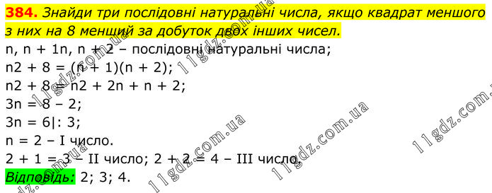 Знайди три послідовні натуральні числа, якщо квадрат меншого з них на 8 менший за добуток двох інших чисел. n, n + 1n, n + 2 – послідовні натуральні числа; n2 + 8 = (n + 1)(n + 2); n2 + 8 = n2 + 2n + n + 2; 3n = 8 – 2; 3n = 6|: 3; n = 2 – I число. 2 + 1 = 3 – ІІ число; 2 + 2 = 4 – ІІІ число. Відповідь: 2; 3; 4.