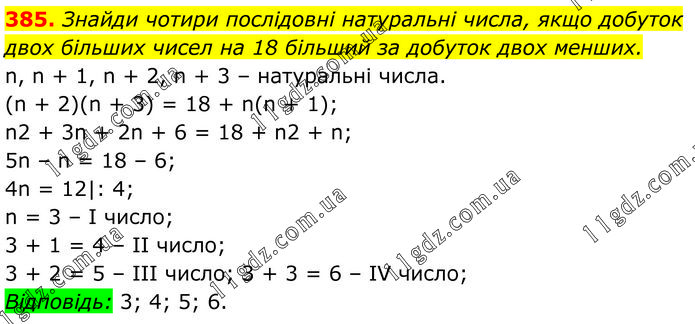 Знайди чотири послідовні натуральні числа, якщо добуток двох більших чисел на 18 більший за добуток двох менших. n, n + 1, n + 2, n + 3 – натуральні числа. (n + 2)(n + 3) = 18 + n(n + 1); n2 + 3n + 2n + 6 = 18 + n2 + n; 5n – n = 18 – 6; 4n = 12|: 4; n = 3 – I число; 3 + 1 = 4 – ІІ число; 3 + 2 = 5 – ІІІ число; 3 + 3 = 6 – IV число; Відповідь: 3; 4; 5; 6.