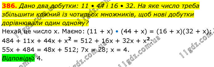 Дано два добутки: 11 • 44 і 16 • 32. На яке число треба збільшити кожний із чотирьох множників, щоб нові добутки дорівнювали один одному? Нехай це число х. Маємо: (11 + х) • (44 + х) = (16 + х)(32 + х); 484 + 11х + 44х + х2 = 512 + 16х + 32х + х2; 55х + 484 = 48х + 512; 7х = 28; х = 4. Відповідь: 4.