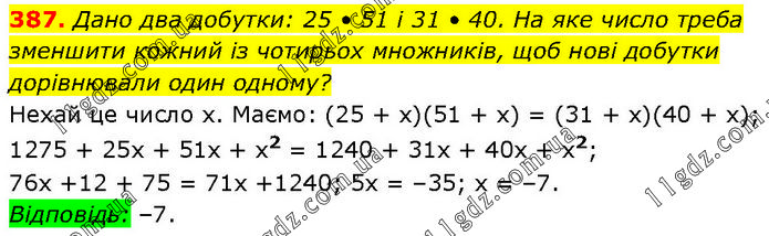 Дано два добутки: 25 • 51 і 31 • 40. На яке число треба зменшити кожний із чотирьох множників, щоб нові добутки дорівнювали один одному? Нехай це число х. Маємо: (25 + х)(51 + х) = (31 + х)(40 + х); 1275 + 25х + 51х + х2 = 1240 + 31х + 40х + х2; 76х +12 + 75 = 71х +1240; 5х = –35; х = –7. Відповідь: –7.