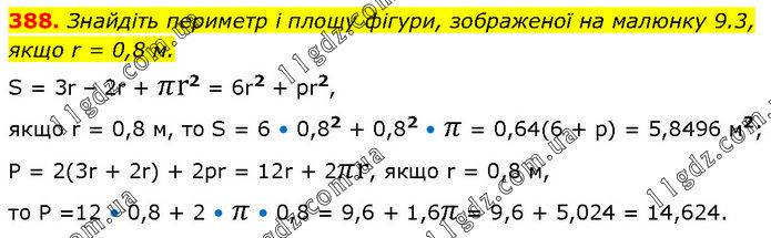 Знайдіть периметр і площу фігури, зображеної на малюнку 9.3, якщо r = 0,8 м. S = 3r – 2r + πr2 = 6r2 + рr2, якщо r = 0,8 м, то S = 6 • 0,82 + 0,82 • π = 0,64(6 + р) = 5,8496 м2; P = 2(3r + 2r) + 2рr = 12r + 2πr, якщо r = 0,8 м, то P =12 • 0,8 + 2 • π • 0,8 = 9,6 + 1,6π = 9,6 + 5,024 = 14,624.