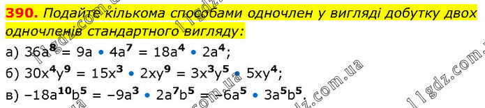 Подайте кількома способами одночлен у вигляді добутку двох одночленів стандартного вигляду: а) 36а8 = 9а • 4а7 = 18а4 • 2а4; б) 30х4у9 = 15x3 • 2ху9 = Зх3у5 • 5ху4; в) –18а10b5 = –9а3 • 2а7b5 = –6а5 • 3а5b5.