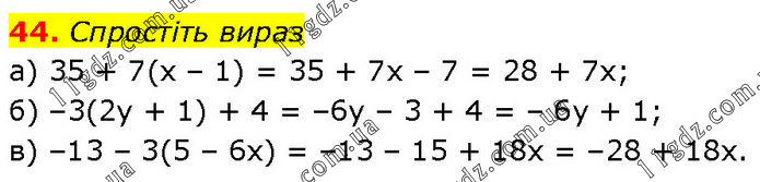 Спростіть вираз a) 35 + 7(x – 1) = 35 + 7x – 7 = 28 + 7x; б) –3(2у + 1) + 4 = –6у – 3 + 4 = – 6у + 1; в) –13 – 3(5 – 6x) = –13 – 15 + 18x = –28 + 18x.