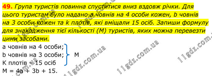 Група туристів повинна спуститися вниз вздовж річки. Для цього туристам було надано а човнів на 4 особи кожен, b човнів на 3 особи кожен та k плотів, які вміщали 15 осіб. Запиши формулу для знаходження тієї кількості (M) туристів, яких можна перевезти цими засобами. а човнів на 4 особи; b човнів на 3 особи; М К плотів – 15 осіб M = 4a + 3b + 15.