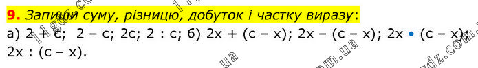 Запиши суму, різницю, добуток і частку виразу: а) 2 + с; 2 – с; 2с; 2 : с; б) 2х + (с – х); 2х – (с – х); 2х • (с – х); 2х : (с – х).