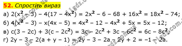 Спростіть вираз а) 2(х2 – 3) – 4(17 – 4х2) = 2х2 – 6 – 68 + 16х2 = 18х2 – 74; б) 4(х2 – 3) – х(4х – 5) = 4x2 – 12 – 4x2 + 5х = 5х – 12; в) с(3 – 2с) + 3(с – 2с2) = Зс – 2с2 + Зс – 6с2 = 6с – 8с2; г) 2у – 3 – 2(а + у – 1) = 2y – 3 – 2а – 2y + 2 = –1 – 2а.