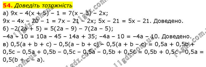 Доведіть тотожність a) 9х – 4(х + 5) – 1 = 7(х – 3) – 2х; 9х – 4х – 20 – 1 = 7х – 21 – 2х; 5х – 21 = 5х – 21. Доведено. б) –2(2а + 5) = 5(2а – 9) – 7(2а – 5); –4а – 10 = 10a – 45 – 14а + 35; –4а – 10 = –4а – 10. Доведено. в) 0,5(а + b + с) – 0,5(а – b + с) – 0,5(а + b – с) = 0,5a + 0,5b + 0,5c – 0,5a + 0,5b – 0,5c – 0,5а – 0,5b + 0,5с = 0,5b + 0,5с – 0,5а = 0,5(b + с – а).