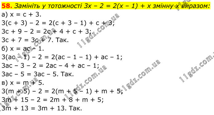 Замініть у тотожності 3x – 2 = 2(x – 1) + x змінну x виразом: a) x = c + 3. 3(c + 3) – 2 = 2(c + 3 – 1) + c + 3; 3c + 9 – 2 = 2c + 4 + c + 3; 3c + 7 = 3c + 7. Так. б) x = ac – 1. 3(ac – 1) – 2 = 2(ac – 1 – 1) + ac – 1; 3ac – 3 – 2 = 2ac – 4 + ac – 1; 3ac – 5 = 3ac – 5. Так. в) x = m + 5. 3(m + 5) – 2 = 2(m + 5 – 1) + m + 5; 3m + 15 – 2 = 2m + 8 + m + 5; 3m + 13 = 3m + 13. Так.