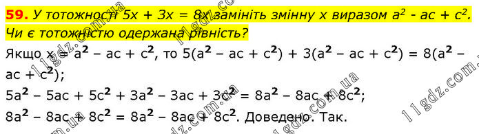У тотожності 5х + Зх = 8х замініть змінну х виразом а2 - ас + с2. Чи є тотожністю одержана рівність? Якщо х = а2 – ас + с2, то 5(а2 – ас + с2) + 3(а2 – ас + с2) = 8(а2 – ас + с2); 5а2 – 5ас + 5с2 + За2 – Зас + Зс2 = 8а2 – 8ас + 8с2; 8а2 – 8ас + 8с2 = 8а2 – 8ас + 8с2. Доведено. Так.