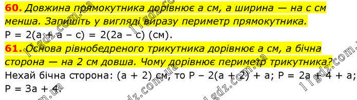 60. Довжина прямокутника дорівнює а см, а ширина — на с см менша. Запишіть у вигляді виразу периметр прямокутника. P = 2(а + а – с) = 2(2а – с) (см). 61. Основа рівнобедреного трикутника дорівнює а см, а бічна сторона — на 2 см довша. Чому дорівнює периметр трикутника? Нехай бічна сторона: (а + 2) см, то P – 2(а + 2) + а; P = 2а + 4 + а; P = За + 4.